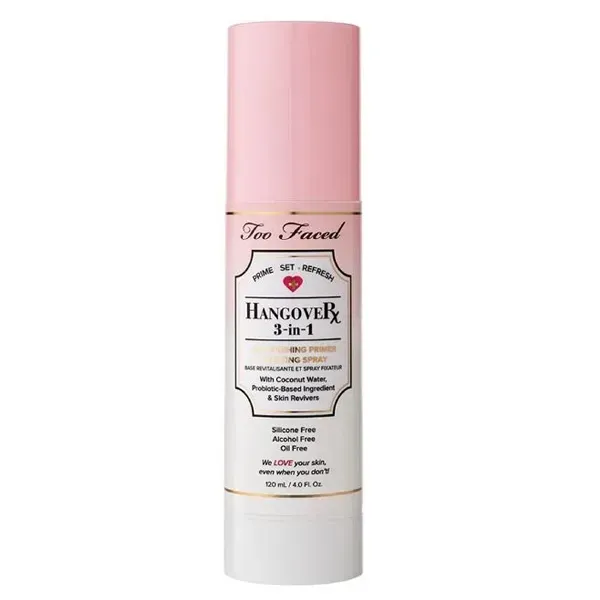 Hangover 3-in-1 Replenishing Primer & Setting Spray! Una niebla infundida con agua de coco tres en uno que pesa, prepara y refresca el maquillaje a la vez que ayuda a mantener la piel hidratada.